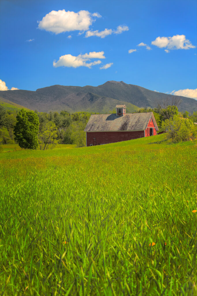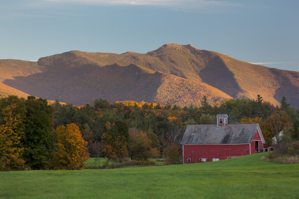 Starting closest to the mountain, we begin on Lower Pleasant Valley Road in Cambridge. This is the quintessential Vermont scene: a red barn framed against Mount Mansfield.