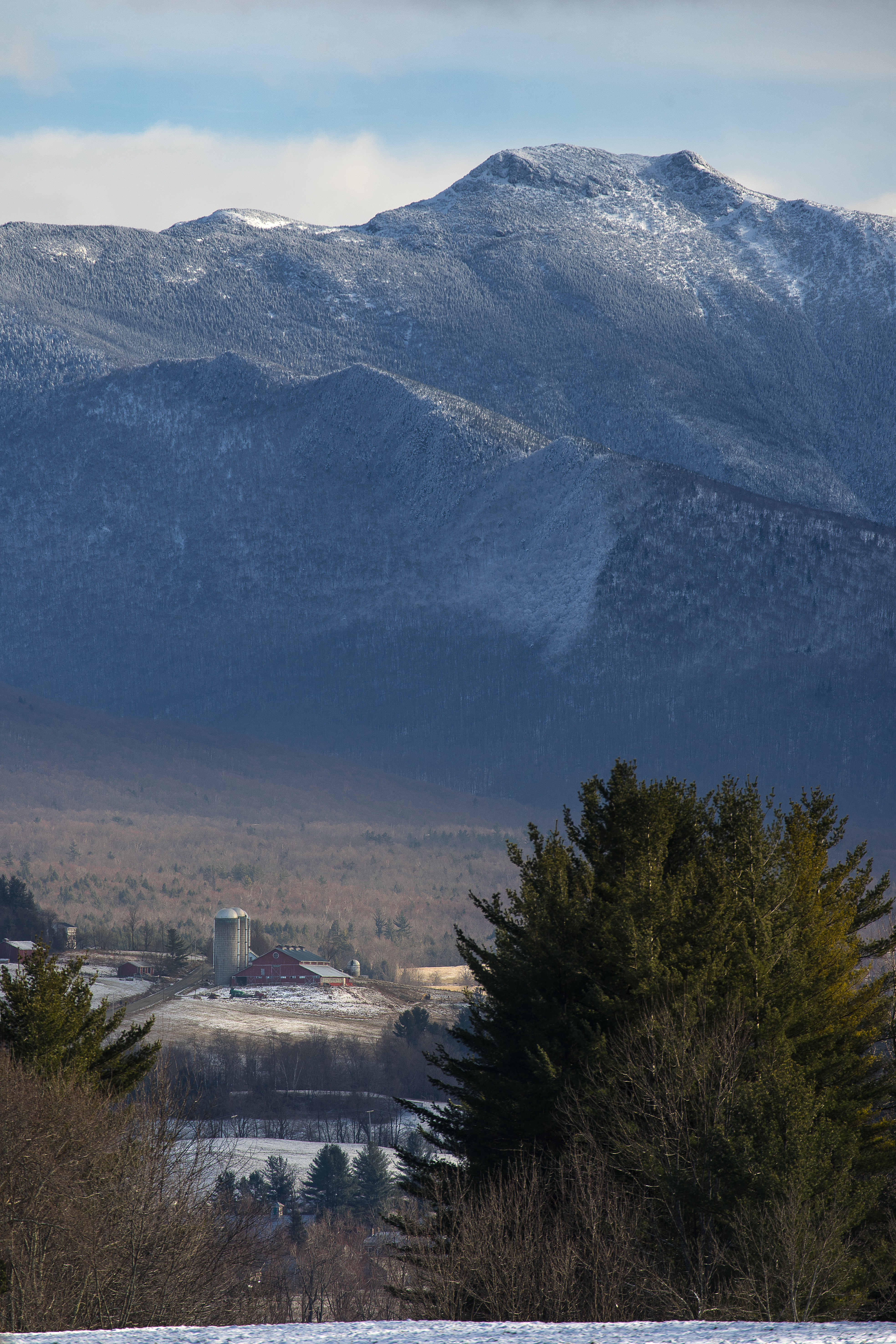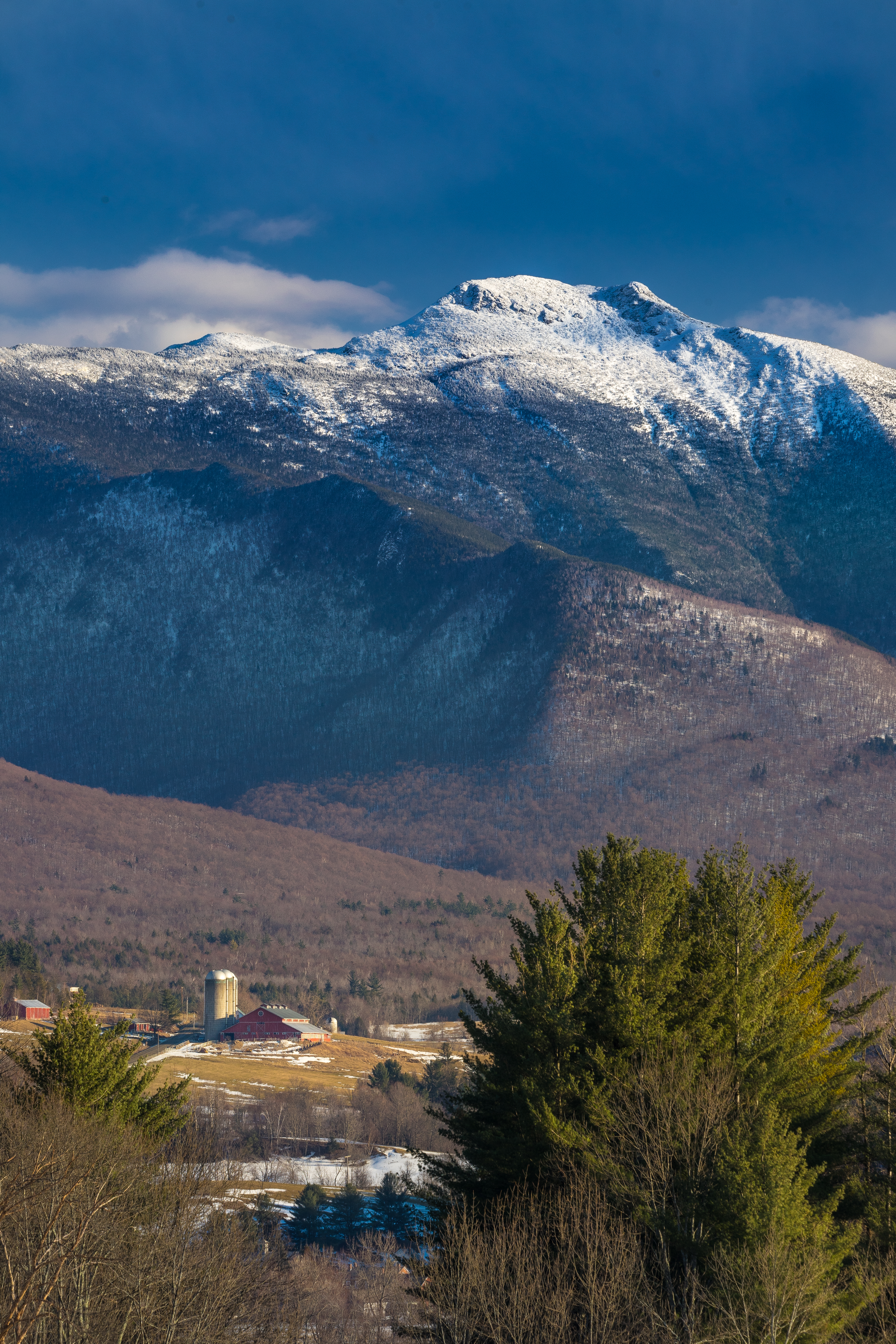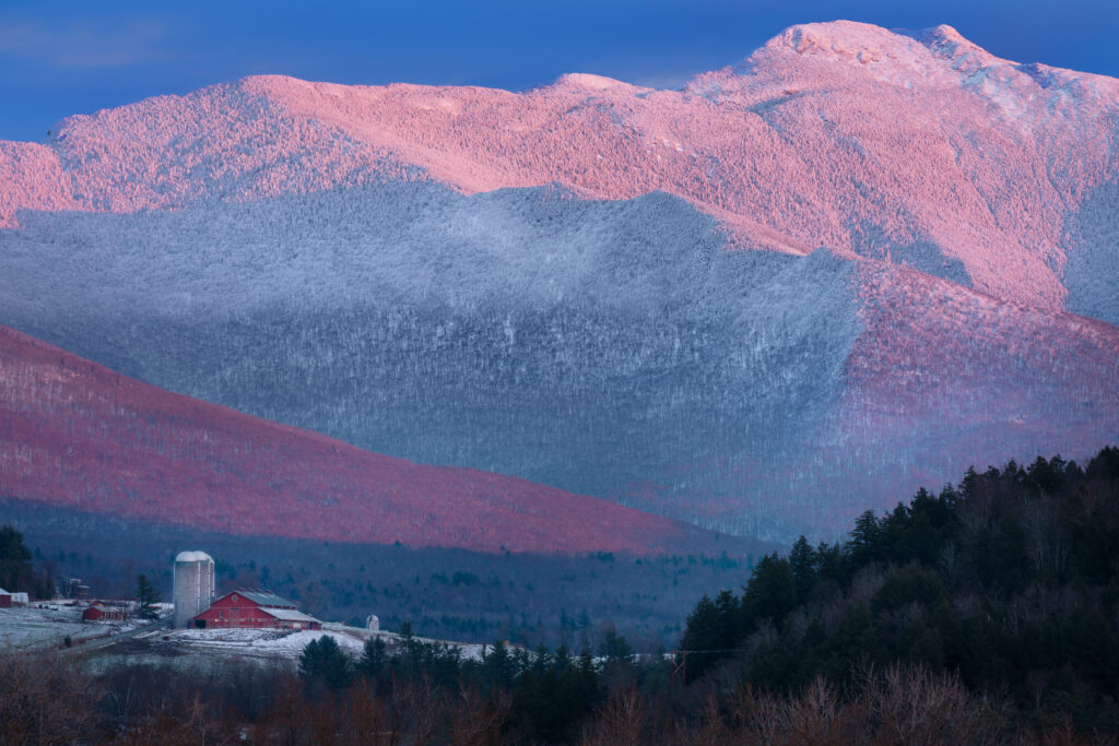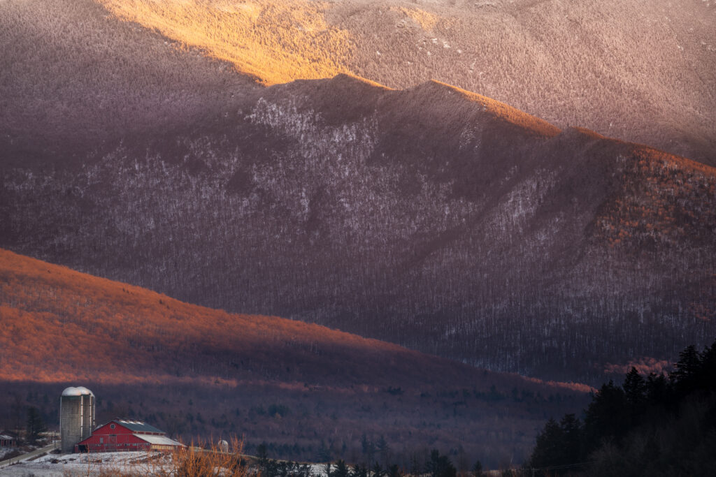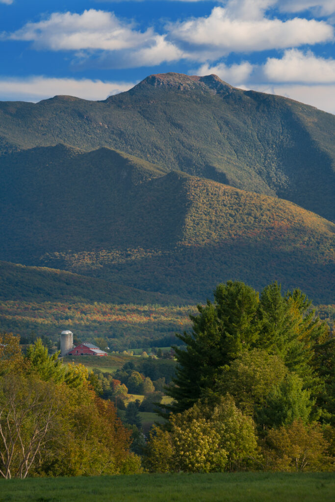 I’ll focus on five prime locations along the mountain’s north side, from Cambridge to Fletcher. While other nearby towns like Underhill offer noteworthy views, these spots provide clean, accessible vantage points from the road or just a few feet away with easy parking. They’re close together, making it possible to visit multiple locations in a single outing. Each features classic Vermont farms as foreground elements, creating balanced compositions with foreground, mountain, and sky.
