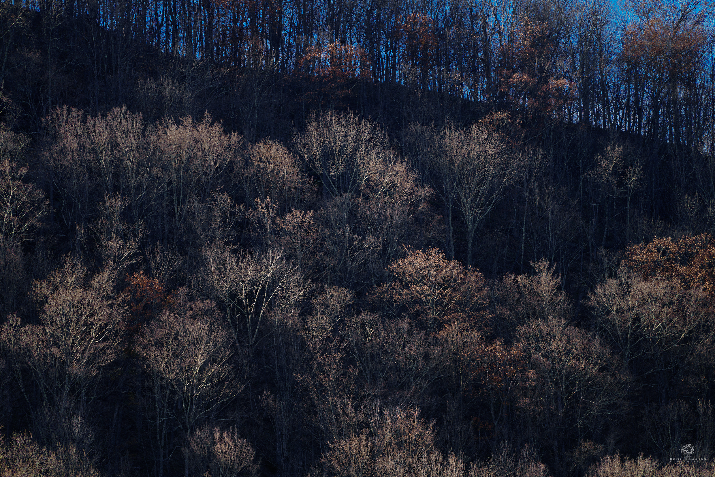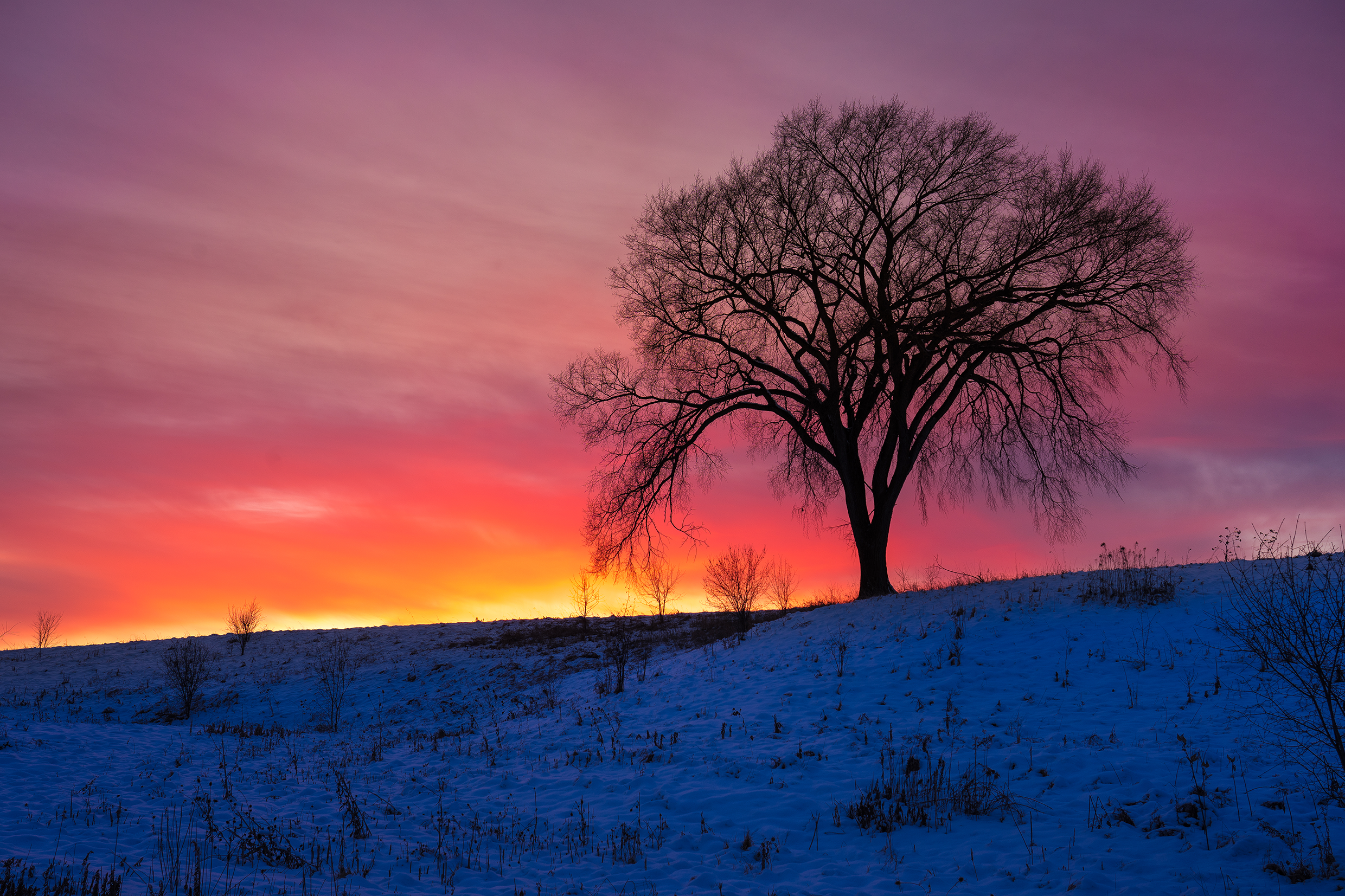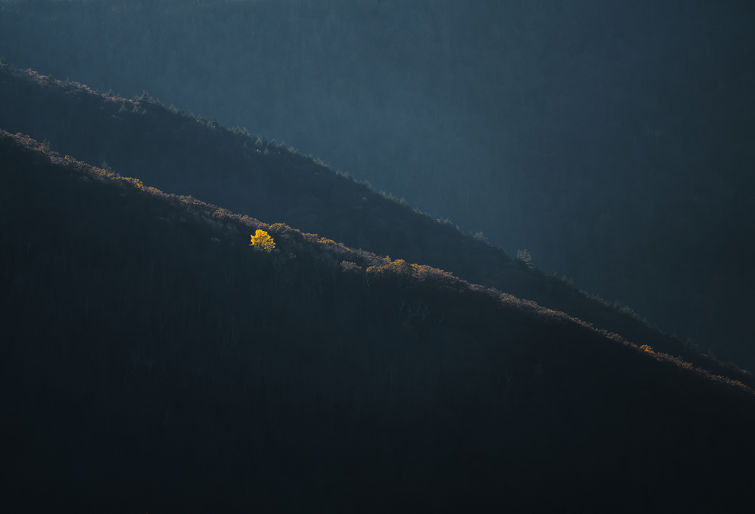 Between autumn and winter there are often lone trees that through factors, such as deep roots or favorable sunlight, manage to hold onto their color long after their surrounding neighbors. Keep an eye on the hills around you. The contrast with their bare neighbors always makes for a good shot.