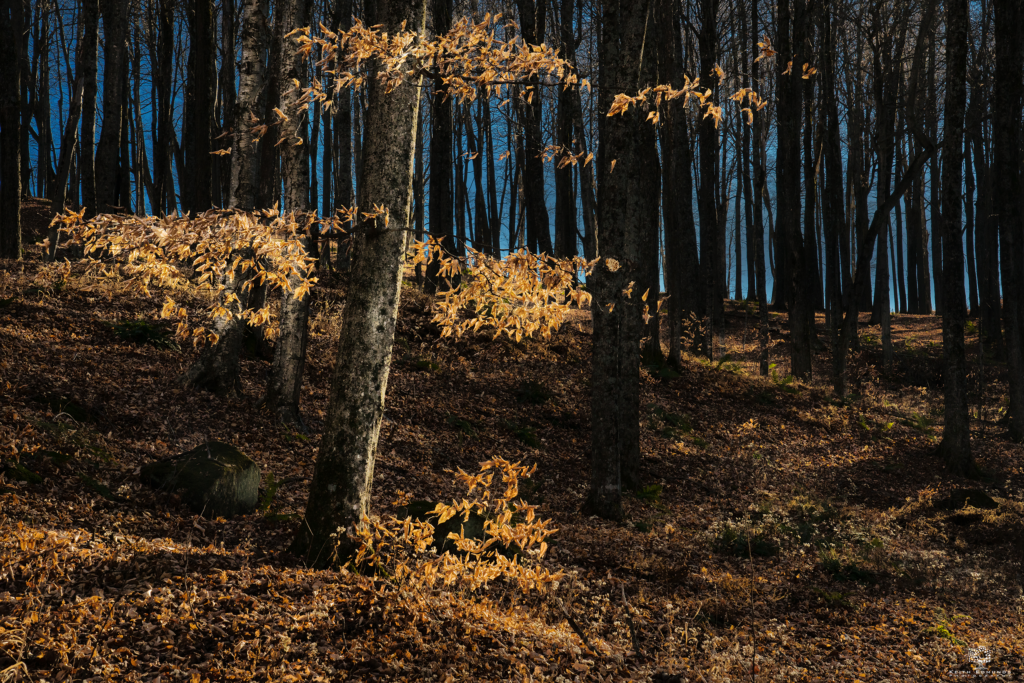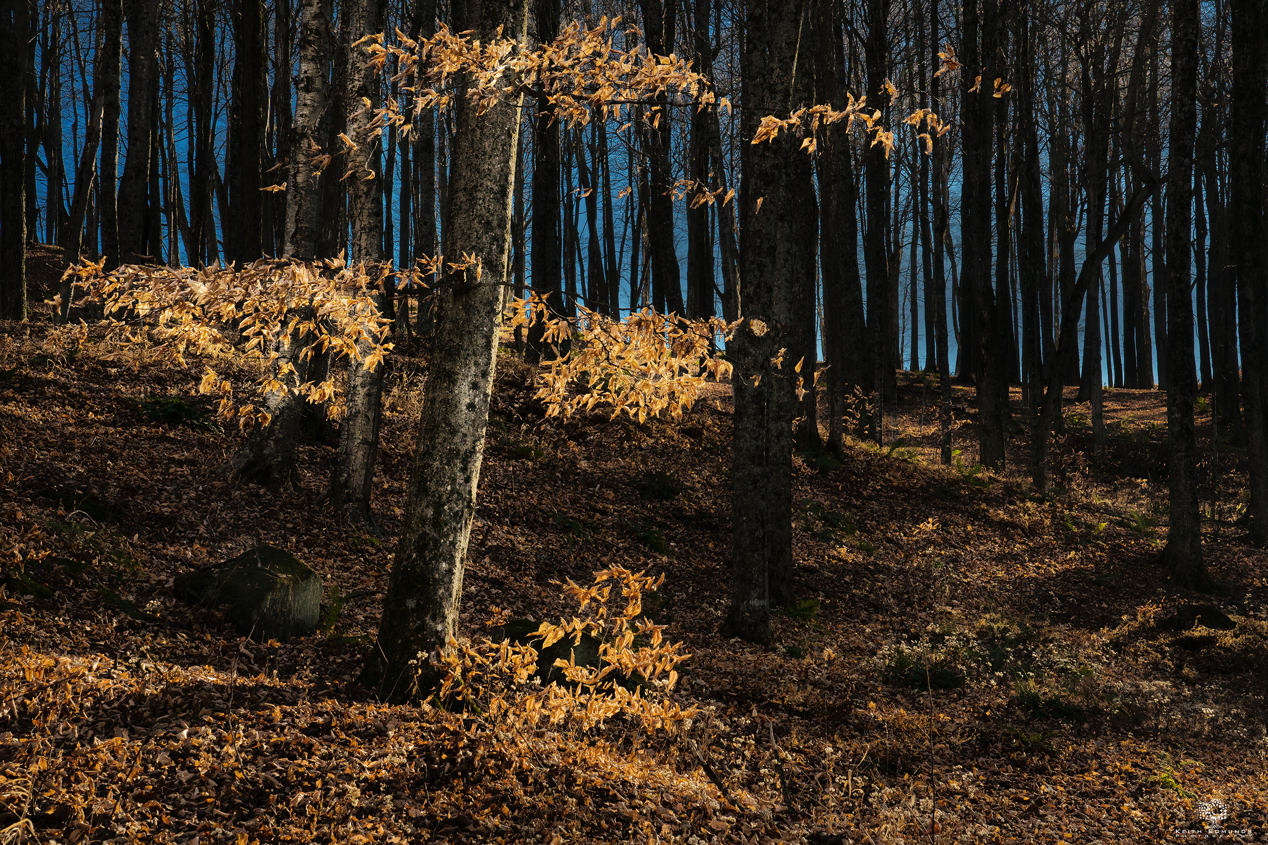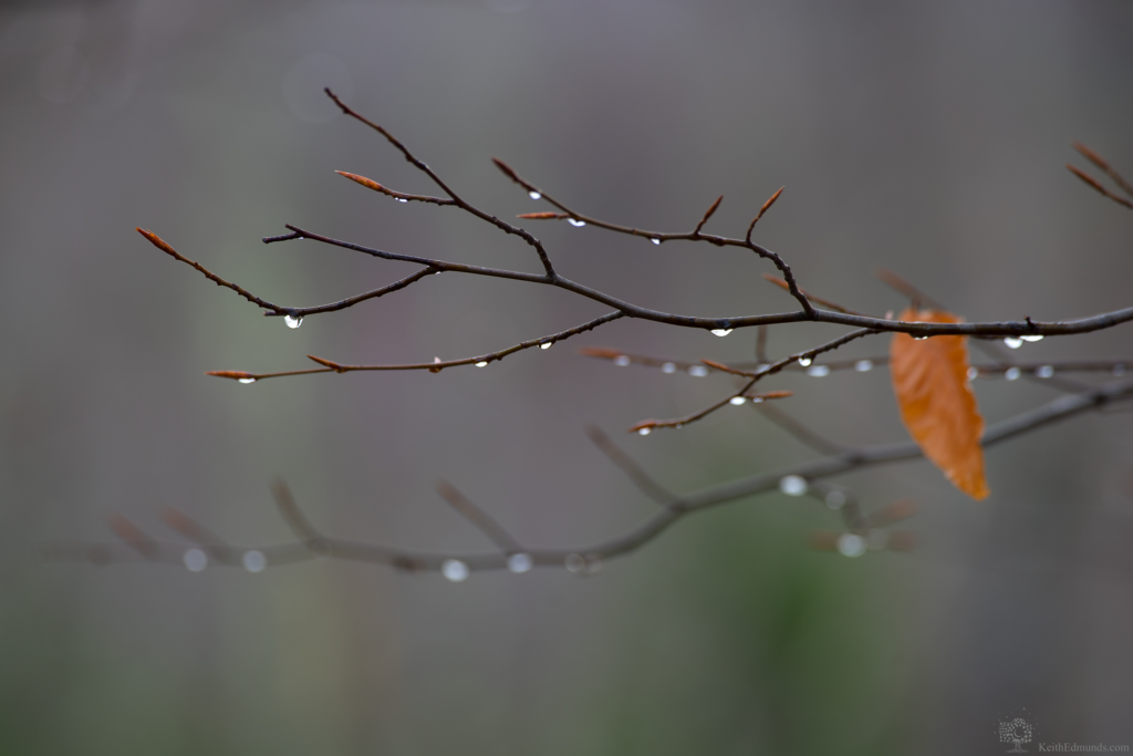 Some trees such as the beech and oak hold their leaves well into stick season. Here in Vermont beeches are especially plentiful on wooded hillsides that are protected from the wind. Driving down any back road I can almost always fine one with color. Sometimes a patch of sunlight can single one out from an otherwise dark background.