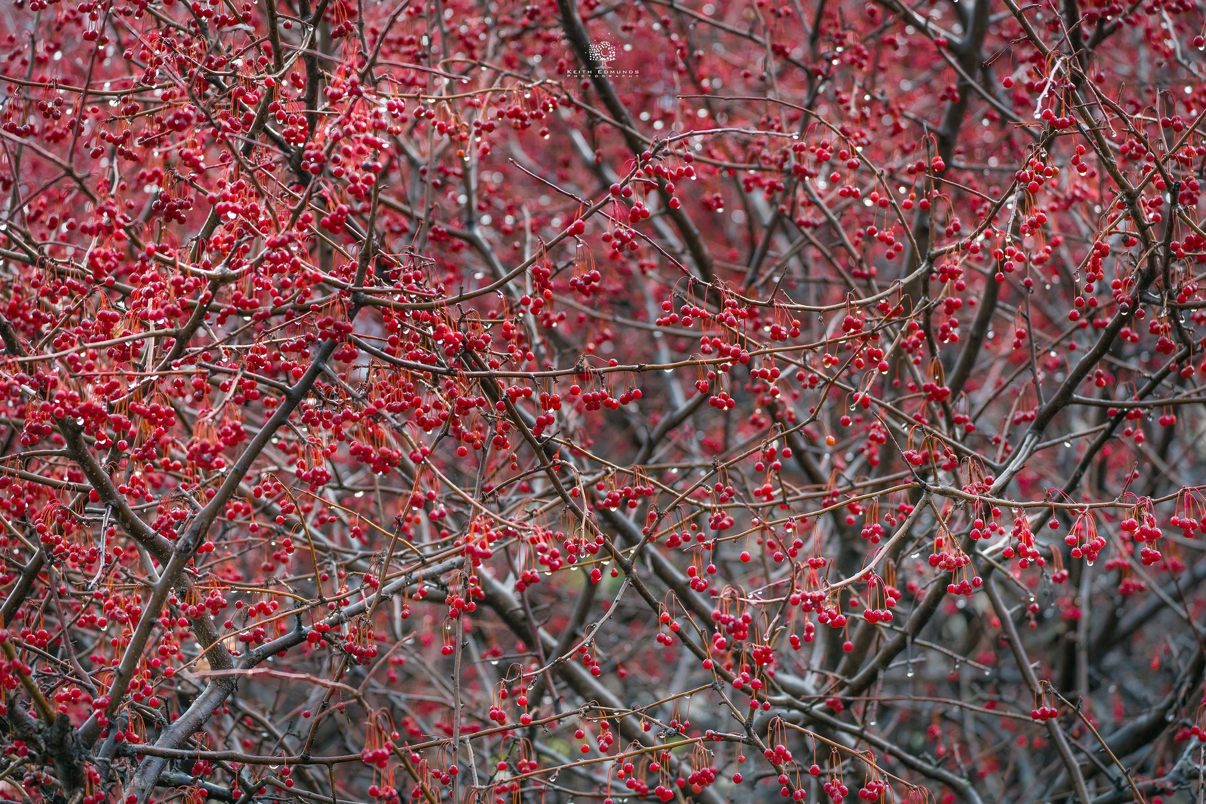 As with the previous image, keep an eye out for individual branches that you can isolate. Photographers and dogs both like it when they find an interesting stick. To separate branch from the background, use a long zoom lens. Open the aperture all of the way and try to get just one branch in focus with everything behind it out of focus. If you can’t seem to get the whole branch in focus (or berries, or whatever caught your eye), then close your aperture back down a few steps so the focus isn’t so narrow. Take a few more shots and keep looking at them on the screen, see how you are doing. Take several, more than you think you need and delete the bad ones later. If the whole shot looks blurry then increase your shutter speed until they stop looking blurry, or put the camera on a tripod. The key here is simplifying the shot. Move up down. Take a few steps left or right to move where your subject falls in relation to the background and don’t put a busy background behind the subject. Also keep an eye out for simple shapes or colors to add interest to a branch such as rain drops or a last un-fallen leaf.