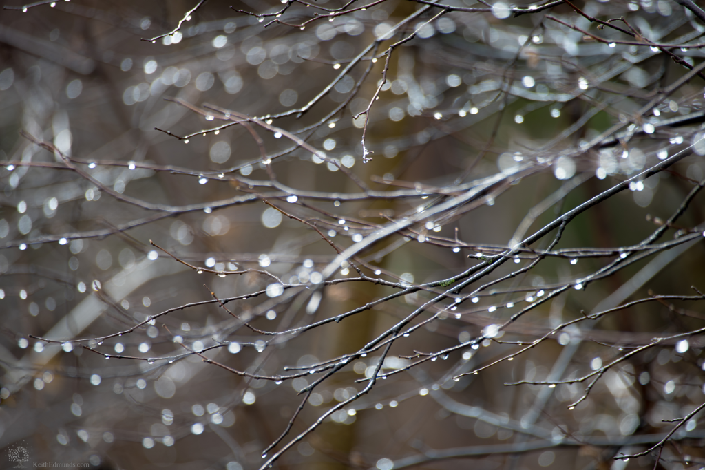 For this one I opened the rear hatch of my SUV and set-up my tripod underneath. I started just looking for individual sticks with raindrops. As usual, I used my long zoom lens and used the aperture wide open to keep a very shallow focus. With all of the raindrops catching light I knew they would make nice bokeh in the background. “Bokeh” is the term for those artistic rounded shapes that small highlights make when you throw them out of focus. Don’t be afraid to play with the focus. I didn’t focus on the obvious closest branch or even the background. Instead the middle branch is the part in focus with bokeh both in front of and behind it. Try this with branches or fields of tall grass. Zoom in and just start rotating the focus ring until you find something interesting. It’s an easy solution when you can’t find a scene that catches your eye. It’s also a prime example of thinking like a photographer because you are actually creating the composition rather than driving around and waiting for a scene to present itself.